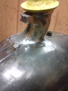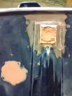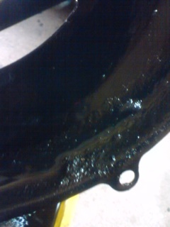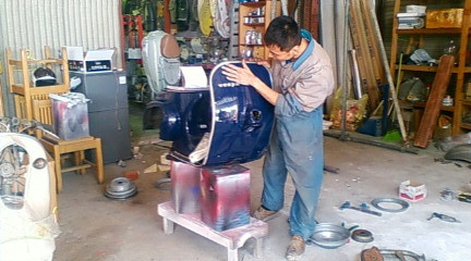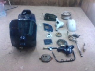 とりあえず、すべての部品を一つ一つ灯油で洗浄し古いグリスや2サイクル特有の混合油の廃棄汚れを洗います。 ファンカバーの裏、油でコテコテなところを灯油でとにかく洗います。サイドカバーを要板金。